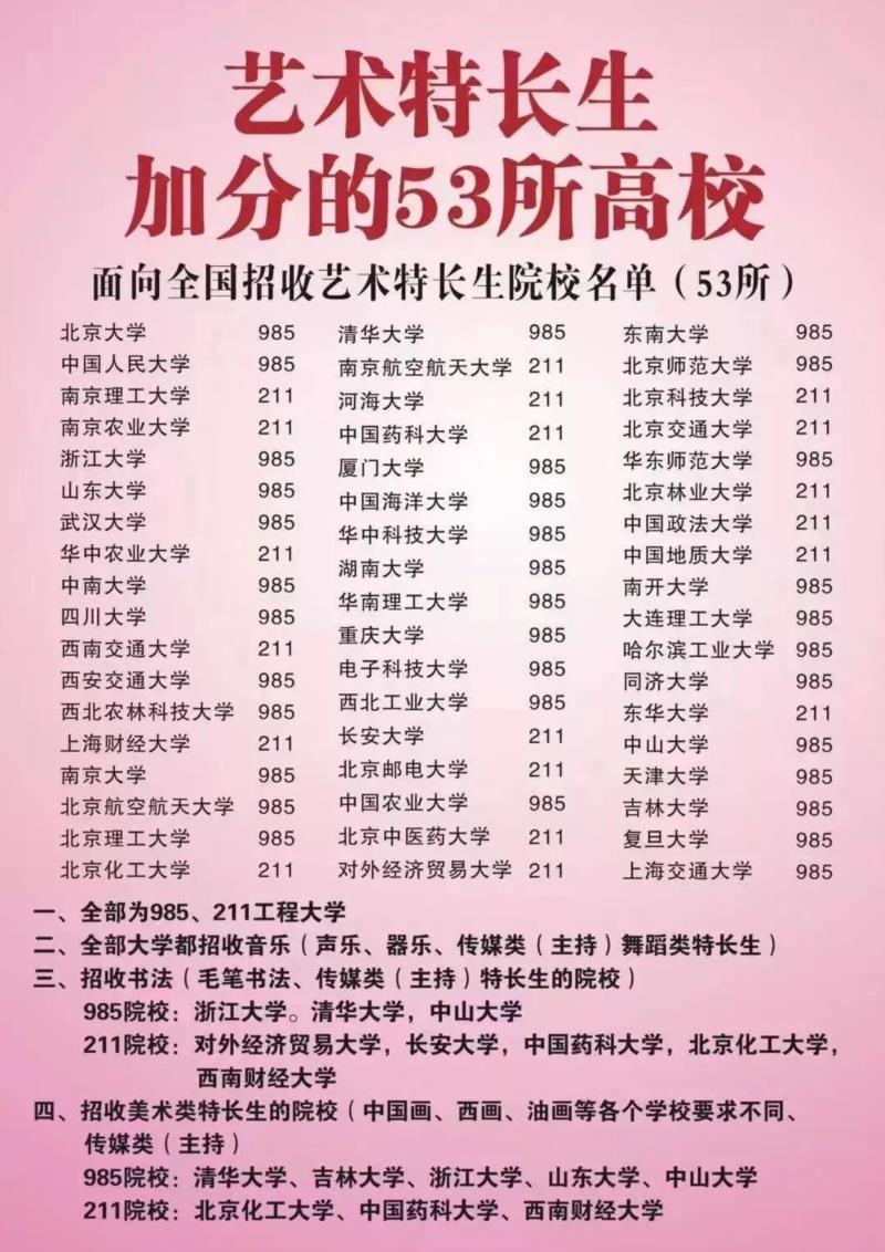 按照新通知,53所高校的艺术特长生仍然可以招生,但“艺术特长生”的叫法不再,变成了53所高校的高水平艺术团招收特长生。