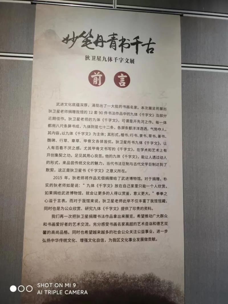 七月,骄阳似火,郁旦带着儿女们再次来到淹城博物馆,观看书法家狄卫星的《九体千字文》书法展,千字文,一千个字不重复,想想都难,别说写了,参观的人流中不时有人嘀咕,难怪著名文化大家周有光曾亲笔题字,以“九体书法,华夏一绝”赞誉狄卫星的书法。
