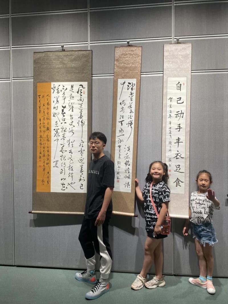 这个展览展出已经超过十年,可郁旦一家人还象是第一次在看。她们在一张张巨幅书法前静静地凝神细看,久久地驻足、流连,象是回眸那穿过历史烟云的点点笔墨,又象是重温老师在教室里手把手现场辅导的珍贵画面。那个多次举办书法个展,出版多本字帖的书法家狄卫星此刻就随着往事历历,从笔墨和照片中栩栩如生地走到了眼前。